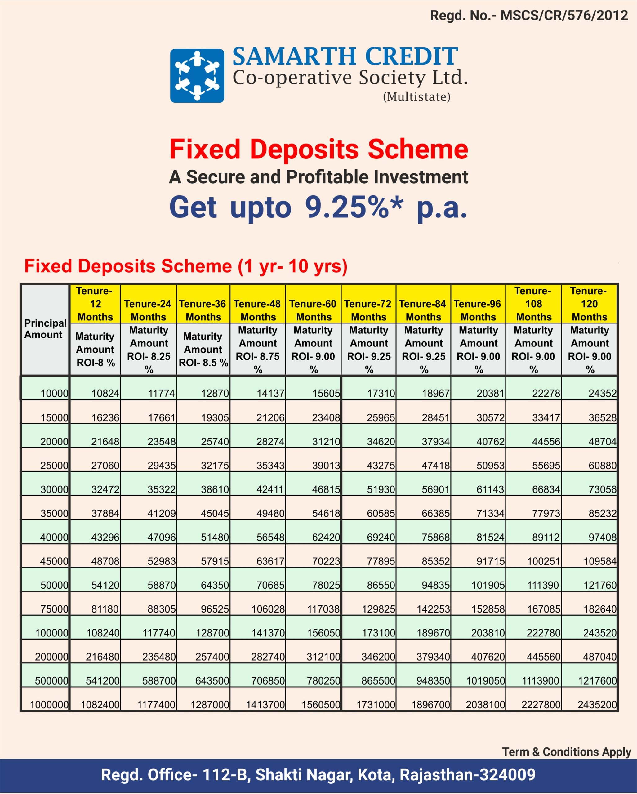 Fixed Deposits at Samarth Credit Co-operative Society offer a safe, profitable investment option with guaranteed returns, attractive interest rates, and the added benefit of loan facilities. Start investing today for a secure financial future.